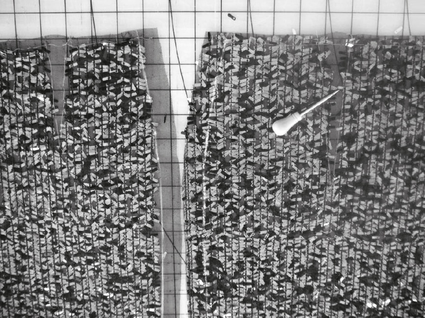Processing sequins requires one thing in particular: patience. For the first fitting it is recommended to make a moulure (model from nettle cloth). To close the seams and darts, all sequins are removed in these regions. They would otherwise poke the wearer or demage the lining, underwaer or stockings. If there are any sequin gaps after sewing, they can be filled in by hand with the removed sequins. In the following example, the selvedge with the wide, unembroidered part was integrated into the front cutting line of the skirt model.