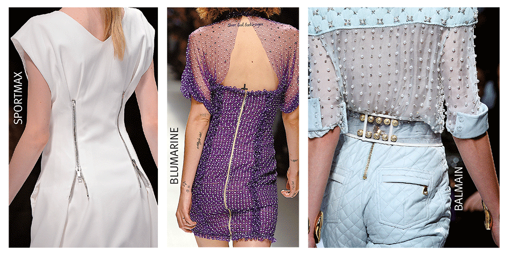 To date: The different types of zipper are constantly being developed. From 1950 on, the spiral zippers make their inexorable triumph. Plastics are becoming increasingly important. In many areas, they are the best choice in terms of strength and economy. Since the 1980s, cotton ribbons have for the most part been replaced by synthetic ribbons. Nickel was replaced by alternative materials in the 1990s for ecological and health reasons. The needs of the fashion industry require new developments, mainly in the optical sector. Shapely tabs, various metal surfaces or special tapes are becoming increasingly important. The development of splash-proof zippers and other high-tech materials has revolutionized outdoor clothing. Instead of elaborate overlaps waterproof zippers are visibly sewn, glued or welded. riri also develops the AquaZip based on a plastic tooth zipper. Further Optical or technical improvements from various manufacturers are constantly coming onto the market. In summer 2014 even haute couture uses the zipper as a stylistic element.