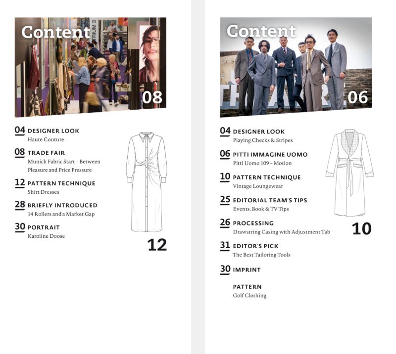 The menswear section begins with the Designer Look »Playing Checks & Stripes«. Classic check and stripe patterns are presented in a contemporary interpretation with a fresh, spring-oriented appeal. The trade fair report focuses on Pitti Immagine Uomo 109 in Florence – a key indicator of long-term developments in menswear, emphasising functional pattern construction, high-quality materials and forward-looking innovations. Pattern technique is dedicated to vintage loungewear, whose characteristic design elements – shawl collars, tie belts and refined fabrics such as flannel or silk – are being reinterpreted as the boundaries between daywear, leisurewear and homewear continue to dissolve. In the processing section, a step-by-step guide demonstrates how to produce a drawstring waistband with Adjustment tab – an elegant and comfortable alternative to a conventional waistband with zip fastening. The menswear section is complemented by editorial recommendations and the Editor’s Pick – featuring proven and high-quality tailoring tools.