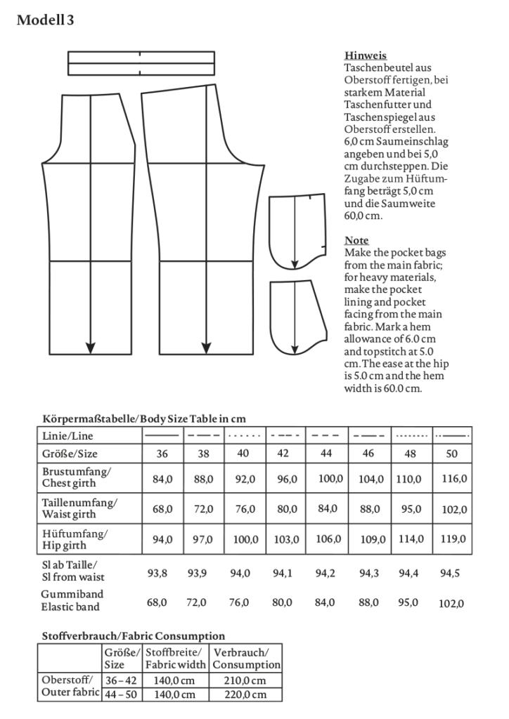 The pattern does not contain detailed sewing instructions. Processing instructions are occasionally placed on the pattern sheet. The pattern pieces for lining, facings and interlining must be copied out independently if not available. The pattern pieces do not contain seam allowances, these must be marked out by hand.