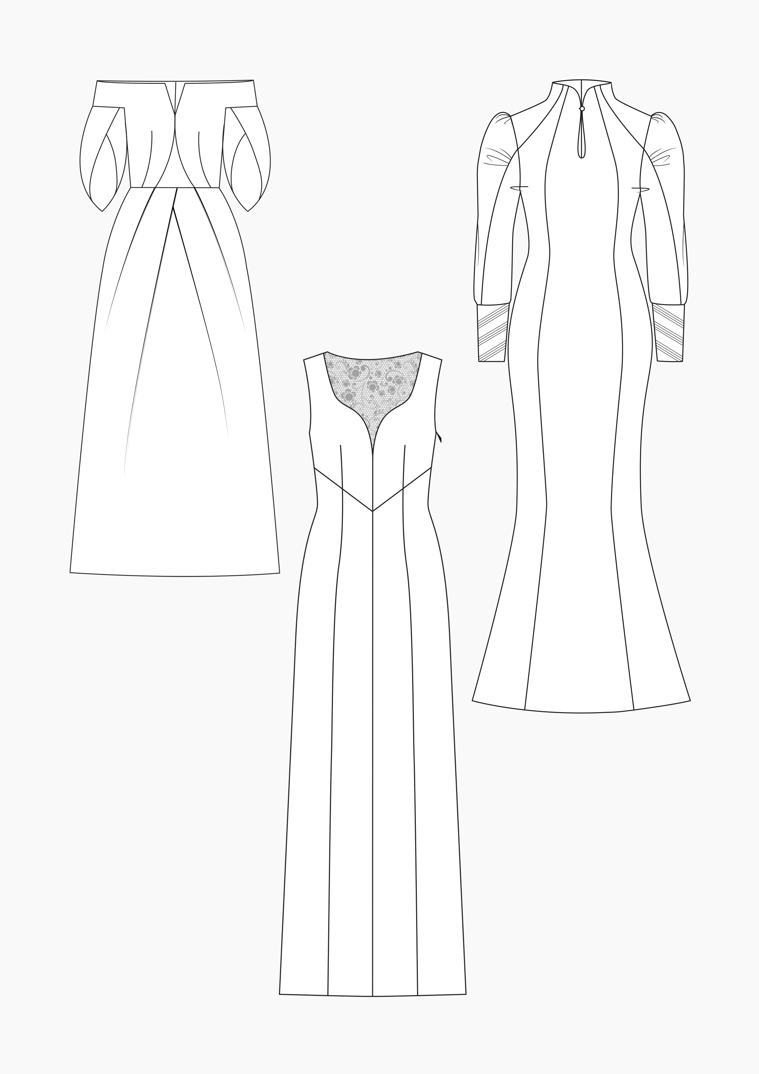 In this E-Dossier you will find instructions for the pattern construction of three different wedding dresses. On the most beautiful day in life, everything should be perfect. The wedding dress plays a major role in this: It should be cut to the bride’s body, make her shine and enchant the groom at the altar. The patternmaking article features three floor-length wedding dresses with feminine silhouettes and interesting details such as deep back necklines, exceptional sleeves and high-necked collars. Possible suitable fabrics for our designs that off er a firmer stand are e.g. Satin, Scuba or Damask. A new look can be achieved by using lace for ornamental details, inserts or upper fabric.