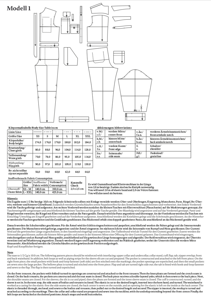 On the pattern sheet you will find an overview of the individual pattern pieces and the number of blanks, a measurement chart for choosing the right size, the fabric consumption, and a legend for the abbreviations.