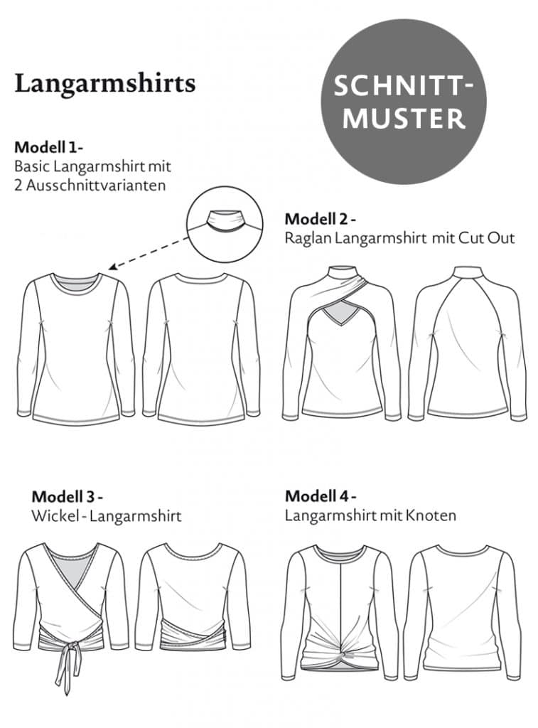 Das beiliegende Schnittmuster enthält vier Langarmshirts für Damen (in den Größen 36 – 46).