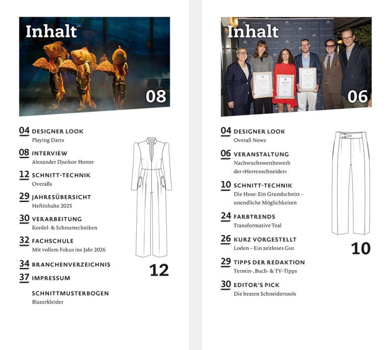 Fachmagazin für Mode und Schnitt-Technik // Overalls// Alexander Djurkov Hotter // Korderl- & Schnurtechniken //Nachwuchswettbewerb der »Herrenschneider« // Die Hose: Ein Grundschnitt - unendliche Möglichkeiten // Loden // Schnittmuster Blazerkleider- Download