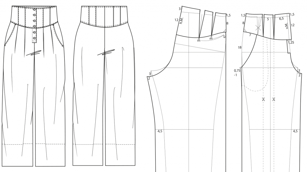 Die Schnitt-Technik zeigt vier verschiedene Hosenmodelle, konstruiert mit den Maßen der Größe 40 im Maßstab 1:6.