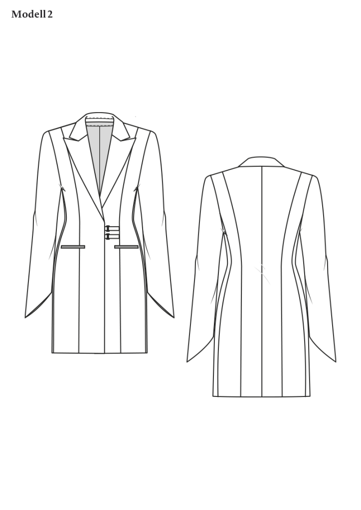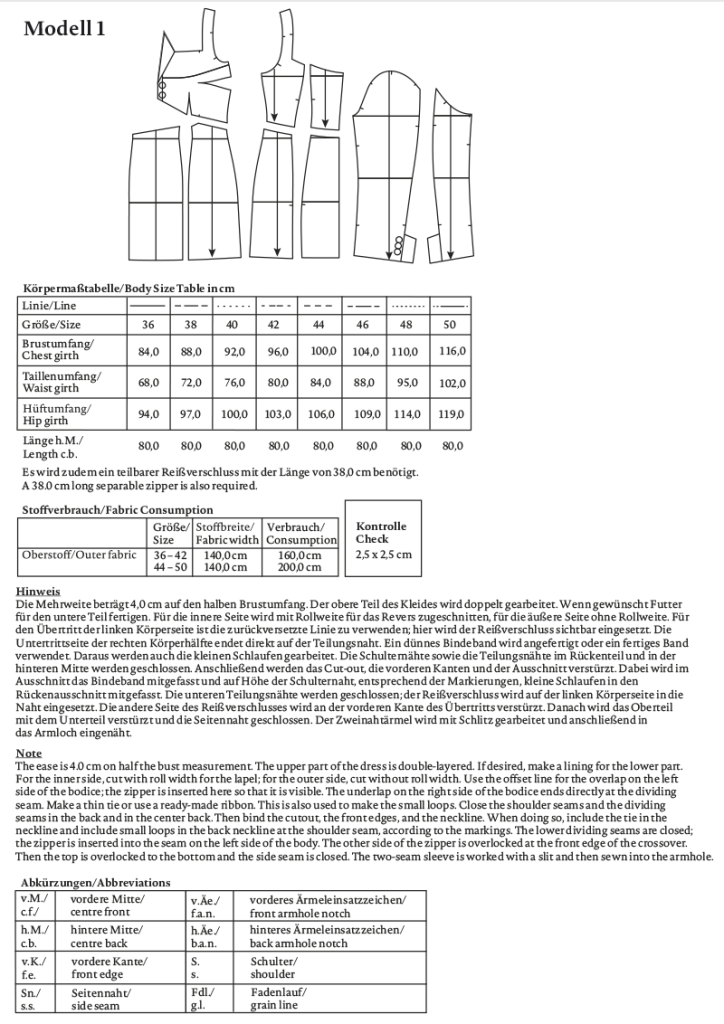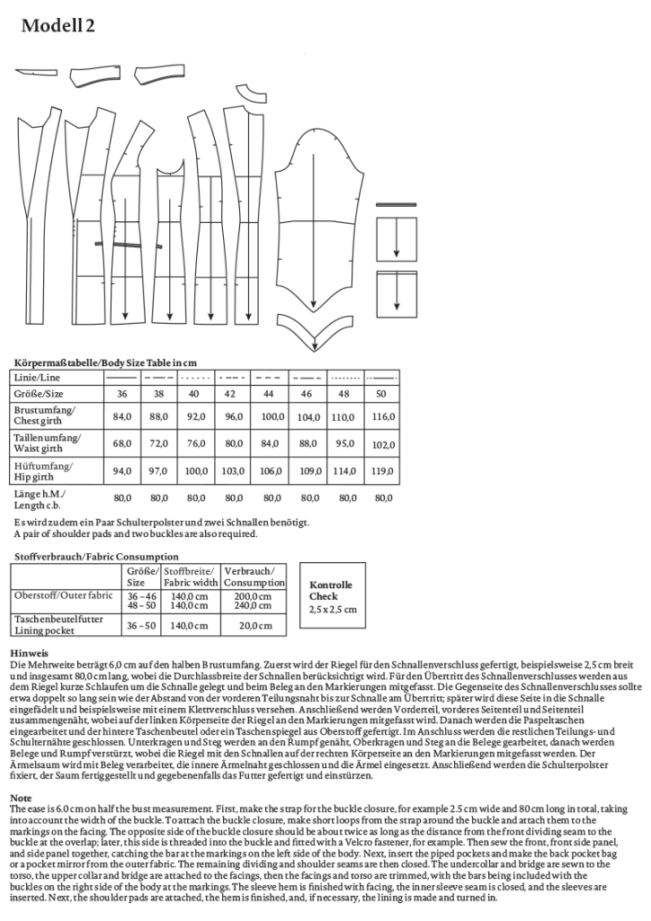 Das Schnittmuster enthält keine detaillierte Nähanleitung. Es werden vereinzelnd Verarbeitungshinweise auf dem Schnittmusterbogen platziert. Die Schnittteile für Futter, Belege und Einlage müssen, wenn nicht vorhanden, eigenständig herauskopiert werden. Die Schnittteile enthalten keine Nahtzugaben, diese müssen eigenhändig angezeichnet werden.