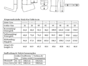 Sie finden auf dem Schnittmusterbogen eine Übersicht der einzelnen Schnittteile und die Anzahl der Zuschnitte, eine Maßtabelle für die Auswahl der richtigen Größe, den Stoffverbrauch und eine Legende für die Abkürzungen.
