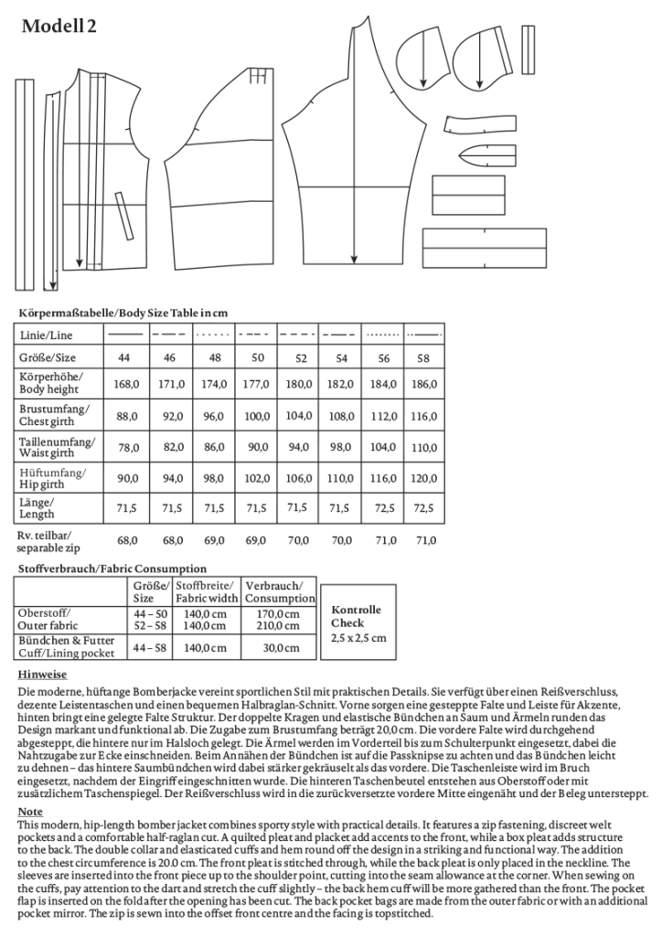Das Schnittmuster enthält keine detaillierte Nähanleitung. Es werden vereinzelnd Verarbeitungshinweise auf dem Schnittmusterbogen platziert. Die Schnittteile für Futter, Belege und Einlage müssen, wenn nicht vorhanden, eigenständig herauskopiert werden. Die Schnittteile enthalten keine Nahtzugaben, diese müssen eigenhändig angezeichnet werden.