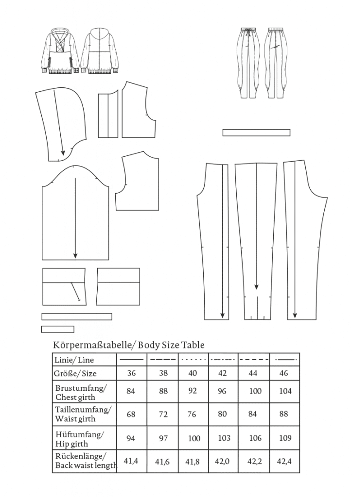 Dieses Schnittmuster enthält zwei Trainingsanzüge in den Größen 36-46. Die beiden Kapuzenpullover und Joggpants sind untereinander kombinierbar.